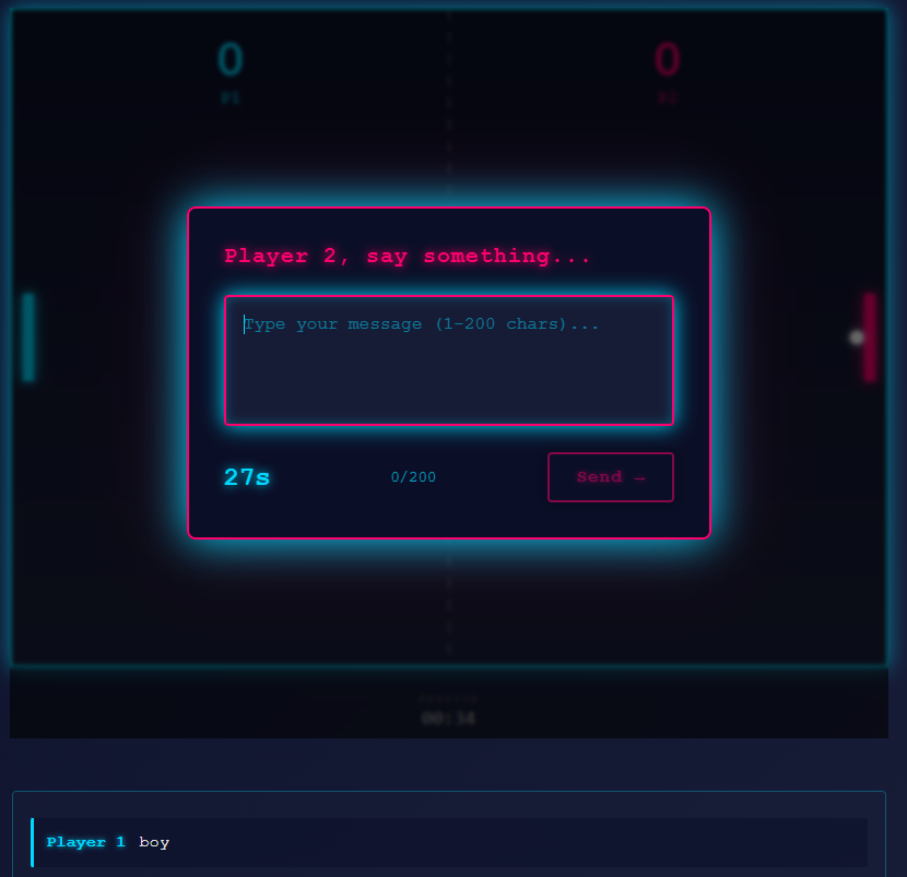 You play Pong with a stranger online. Every time the ball hits your paddle, the game pauses — and you must write something. Anything. You have 30 seconds. Then the ball comes back.